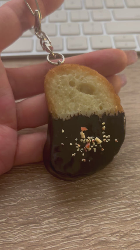 Crispy, crunchy, and dipped in chocolate — this hyper-realistic Rusk Keychain looks just like the real thing! Handmade with incredible attention to detail, it features the signature golden toast-like texture of a classic rusk, finished with a glossy chocolate “dip” for an extra delicious touch.